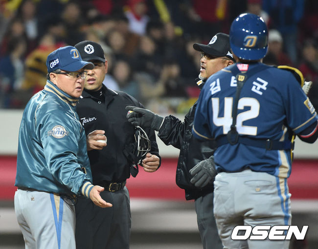 3일 오후 광주-기아챔피언스 필드 에서 열린 '2014 한국야쿠르트 세븐 프로야구' KIA 타이거즈와 NC 다이노스 경기,2회말 1사 2,3루 김선빈의 파울타구 판정에 김경문 감독이 마운드에 올라 김귀한 구심과 이야기를 나누고 있다.