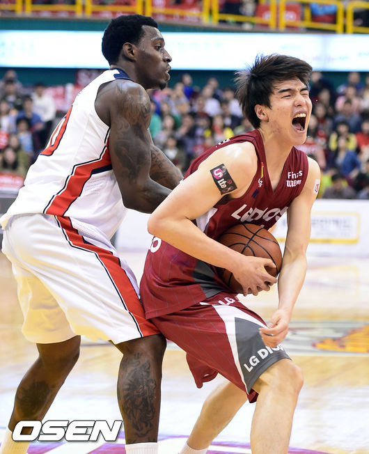 3일 오후 경남 창원실내체육관서 진행된 '2013-2014 프로농구 챔피언 결정전 2차전 창원 LG와 울산 모비스의 경기, 2쿼터 LG 김종규가 모비스 라틀리프에게 파울을 얻어내고 있다