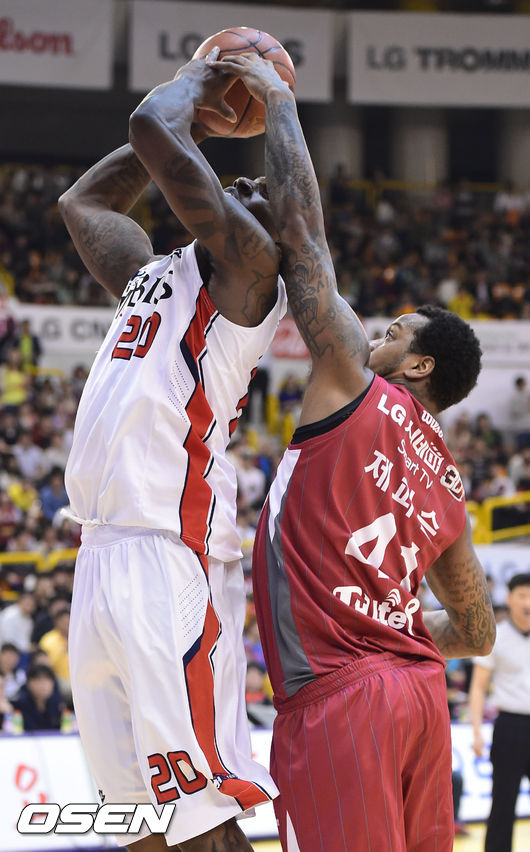 3일 오후 경남 창원실내체육관서 진행된 '2013-2014 프로농구 챔피언 결정전 2차전 창원 LG와 울산 모비스의 경기, 2쿼터 LG 제퍼슨이 모비스 라틀리프의 슛을 슛블록 하고 있다.