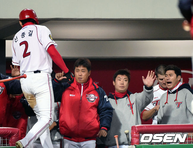 3일 오후 광주-기아챔피언스 필드 에서 열린 '2014 한국야쿠르트 세븐 프로야구' KIA 타이거즈와 NC 다이노스 경기,2회말 2사 3루 이대형의 적시타때 3루주자 신종길 득점을 올리며 환호하고 있다.