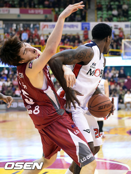3일 오후 경남 창원실내체육관서 진행된 '2013-2014 프로농구 챔피언 결정전 2차전 창원 LG와 울산 모비스의 경기, 2쿼터 LG 김종규가 모비스 라틀리프의 오펜스 파울에 쓰러지고 있다