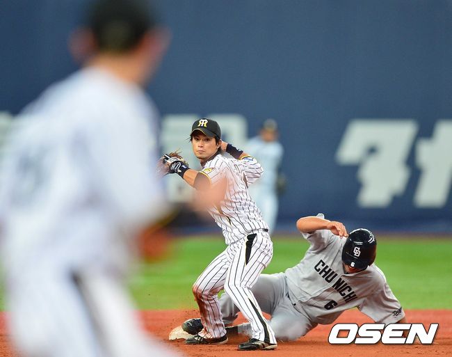 4회초 주니치 공격 무사 1, 2루 상황 와다 가즈히로 유격수앞 땅볼 때 한신 2루수 우에모토 히로키가 1루 주자를 포스아웃 시킨 뒤 3루를 바라보고 있다. 3루 송구는 멈춘 우에모토.