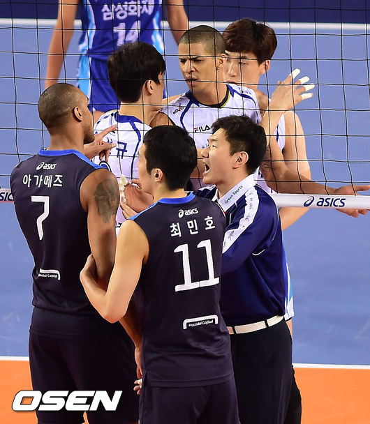 3일 오후 충청남도 천안시 천안유관순체육관서 열린 ‘NH농협 2013-2014시즌 V리그’ 천안 현대캐피탈 스카이워커스와 대전 삼성화재 블루팡스의 챔피언결정전(5전 3선승제) 4차전, 삼성화재 레오와 현대캐피탈 아가메즈가 말다툼을 하고 있다.
