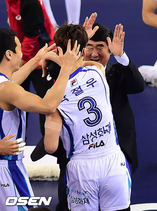 3일 오후 충청남도 천안시 천안유관순체육관서 열린 ‘NH농협 2013-2014시즌 V리그’ 천안 현대캐피탈 스카이워커스와 대전 삼성화재 블루팡스의 챔피언결정전(5전 3선승제) 4차전, 삼성화재 박철우가 공격에 성공한 후 신치용 감독과 하이파이브를 하고 있다.