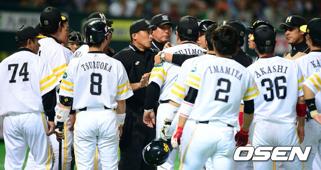 4회말 무사 소프트뱅크 야나기타 유키가 니혼햄 다니모토 게이스케의 사구에 양팀 선수들이 벤치클리어링이 일어났다.
