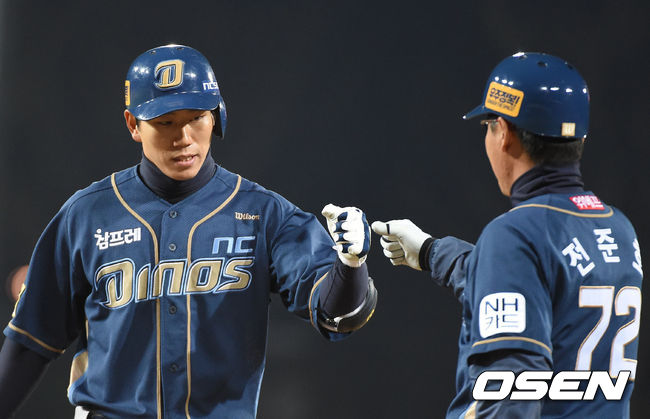 3일 오후 광주-기아챔피언스 필드 에서 열린 '2014 한국야쿠르트 세븐 프로야구' KIA 타이거즈와 NC 다이노스 경기,4회초 1사 2,3루 모창민 1타점 적시타를 날리고 전준호 코치의 환영을 받고 있다.