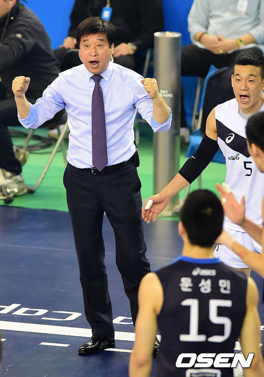3일 오후 충청남도 천안시 천안유관순체육관서 열린 ‘NH농협 2013-2014시즌 V리그’ 천안 현대캐피탈 스카이워커스와 대전 삼성화재 블루팡스의 챔피언결정전(5전 3선승제) 4차전, 현대캐피탈 김호철 감독이 응원을 하고 있다.