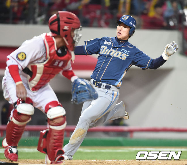 3일 오후 광주-기아챔피언스 필드 에서 열린 '2014 한국야쿠르트 세븐 프로야구' KIA 타이거즈와 NC 다이노스 경기,4회초 1사 1,3루 이종욱 희생플라이때 3루주자 오정복 태그업 득점을 올리고 있다.