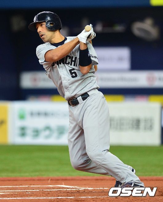 6회초 주니치 공격 무사 만루 상황 와다 가즈히로가 2타점 적시 좌전안타를 날리고 있다.