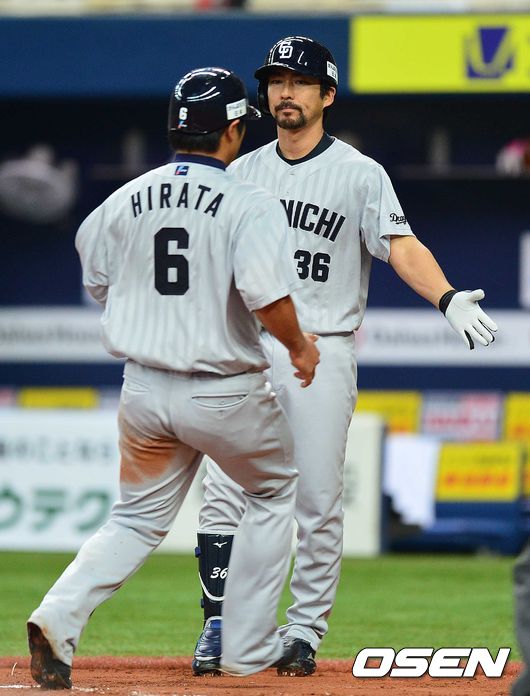 6회초 주니치 공격 1사 1, 3루 상황 한신 포수 후지이의 포일로 3루주자 히라타가 홈을 밟으며 대타 오가사와라와 인사를 나누고있다.