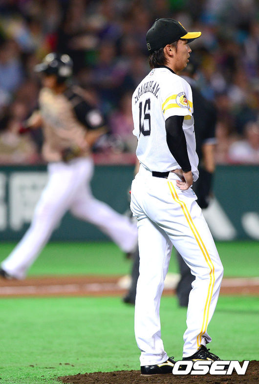 5회초 1사 1루 소프트뱅크 히가시하마 나오가 니혼햄 나카타 쇼에게 투런 홈런을 허용한 뒤 아쉬워하고 있다.