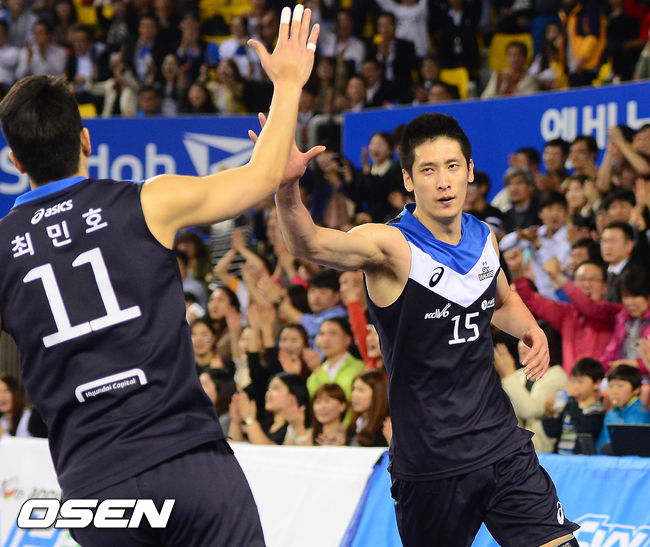 3일 오후 충청남도 천안시 천안유관순체육관서 열린 ‘NH농협 2013-2014시즌 V리그’ 천안 현대캐피탈 스카이워커스와 대전 삼성화재 블루팡스의 챔피언결정전(5전 3선승제) 4차전, 현대캐피탈 문성민이 공격에 성공한 후 최민호와 하이파이브를 하고 있다.