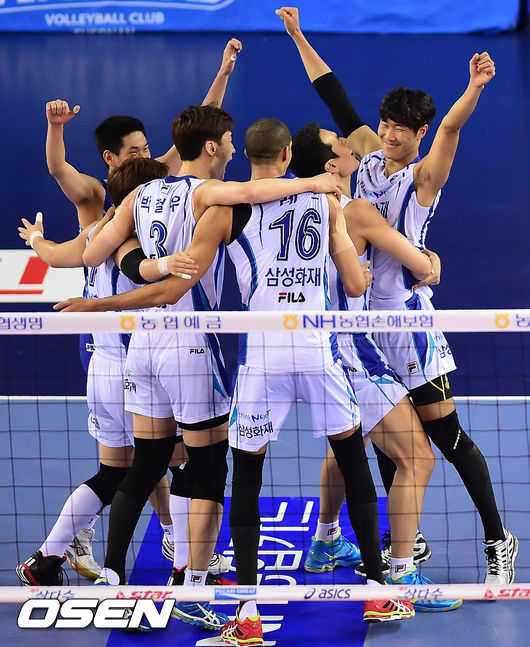 3일 오후 충청남도 천안시 천안유관순체육관서 열린 ‘NH농협 2013-2014시즌 V리그’ 천안 현대캐피탈 스카이워커스와 대전 삼성화재 블루팡스의 챔피언결정전(5전 3선승제) 4차전, 공격에 성공한 삼성화재 선수들이 기뻐하고 있다.