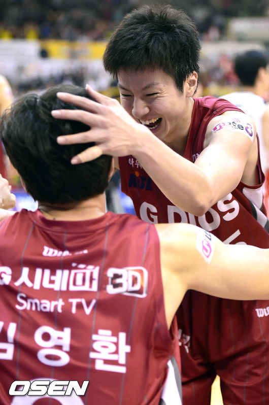 3일 오후 경남 창원실내체육관서 진행된 '2013-2014 프로농구 챔피언 결정전 2차전 창원 LG와 울산 모비스의 경기,3쿼터 LG 김영환의 동점 버저비터때 김시래가 김영환과 기뻐하고 있다.