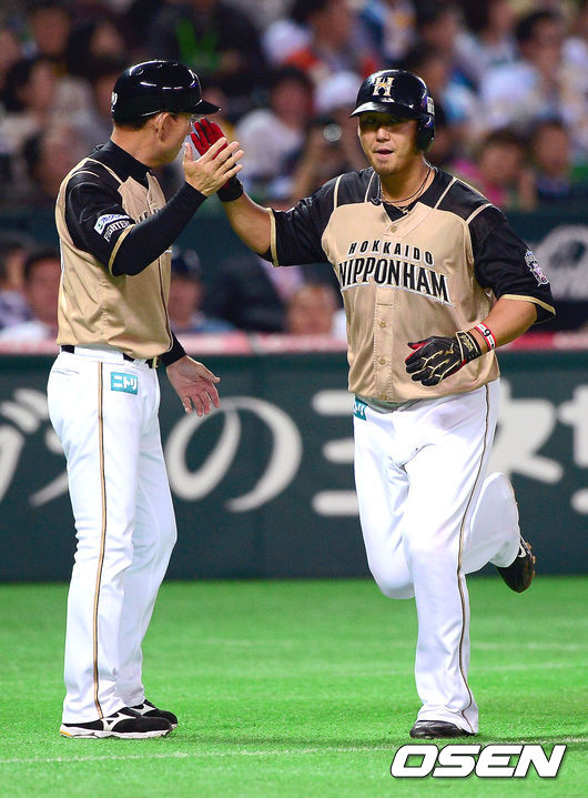 5회초 2사 1루 니혼햄 나카타 쇼가 투런 홈런을 때린 뒤 3루 코치와 하이파이브를 하고 있다.