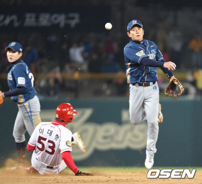 3일 오후 광주-기아챔피언스 필드 에서 열린 '2014 한국야쿠르트 세븐 프로야구' KIA 타이거즈와 NC 다이노스 경기,5회말 1사 1루 김주찬의 내야땅볼때 NC 손시헌 유격수가 1루 주자 이대형을 포스아웃 시키며 1루에 송구 병살아웃 처리시키고 있다.