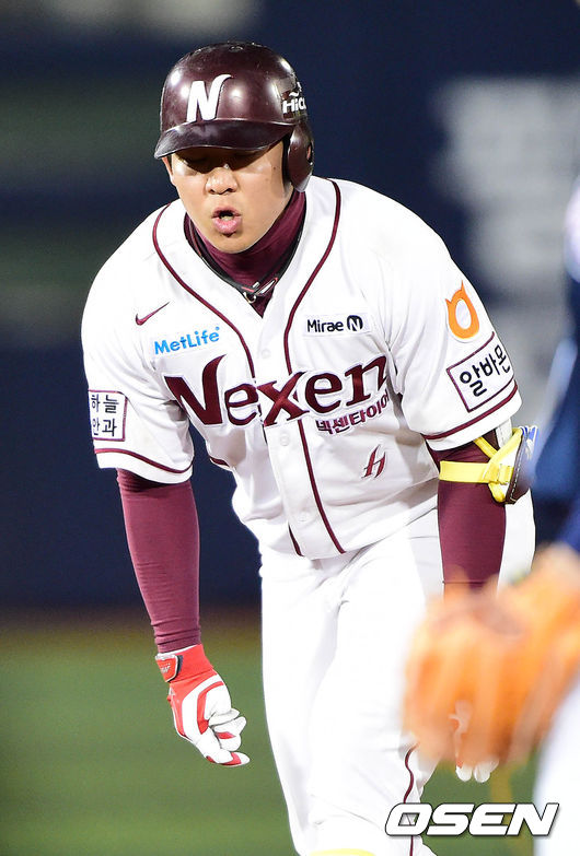 3일 오후 서울 목동구장에서 열린 '2014 한국야쿠르트 세븐 프로야구' 넥센 히어로즈와 두산 베어스의 경기 6회말 1사 1루 김민성이 우익수 오른쪽 2루타를 치고 2루에서 있다.