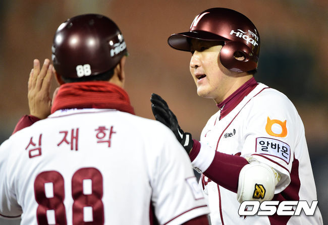 3일 오후 서울 목동구장에서 열린 '2014 한국야쿠르트 세븐 프로야구' 넥센 히어로즈와 두산 베어스의 경기 6회말 2사 만루 대타 유한준이 1타점 적시타를 치고 심재학 코치와 하이파이브를 하고 있다.