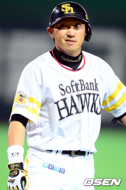 7회말 2사 2루 소프트뱅크 우치카와 세이치가 자신의 타구가 우익수 호수비에 잡혀 아쉬워하고 있다.