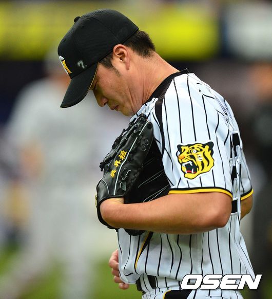 9회초 주니치 공격, 팀이 7-3으로 리드하고 있는 가운데 마운드에 오른 한신 마무리투수 오승환이 1사 1루 상황에서 오시마 요헤이에게 우중간 3루타로 1실점한 뒤 아쉬워하고 있다.