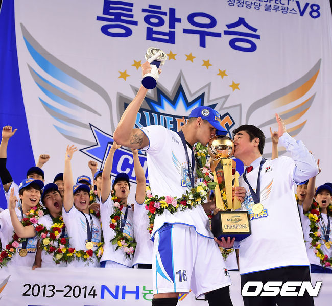 레오-신치용 감독,'기쁨의 트로피 키스! V8!'