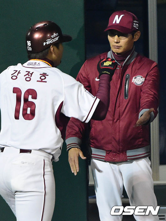 3일 오후 서울 목동구장에서 열린 '2014 한국야쿠르트 세븐 프로야구' 넥센 히어로즈와 두산 베어스의 경기 7회말 2사 1,2루 윤석민의 1타점 적시타에 홈을 밟은 강정호가 염경엽 감독과 하이파이브를 하고 있다.