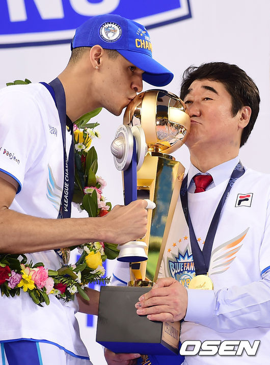 레오-신치용 감독,'감격의 우승 트로피 키스!'
