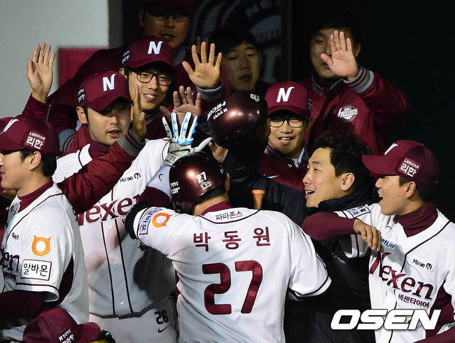 3일 오후 서울 목동구장에서 열린 '2014 한국야쿠르트 세븐 프로야구' 넥센 히어로즈와 두산 베어스의 경기 8회말 1사 3루 박동원이 희생플라이를 치고 덕아웃에서 동료들의 격려를 받고 있다.