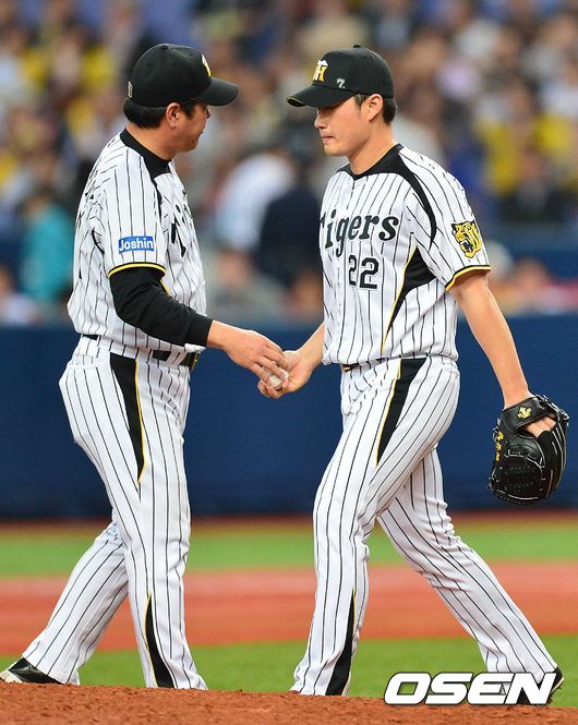 9회초 주니치 공격 팀이 7-3으로 리드하고 있는 가운데 오승환이 마운드에 올라 한신 나카니시 키요오키 투수코치에게 공을 건네받고 있다./dreamer@osen.co.kr