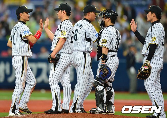 9회초 주니치 공격 팀이 7-3으로 리드하고 있는 가운데 마운드에 오른 오승환이 1실점하며 경기를 매조지한 뒤 동료들과 하이파이브를 나누고 있다./dreamer@osen.co.kr