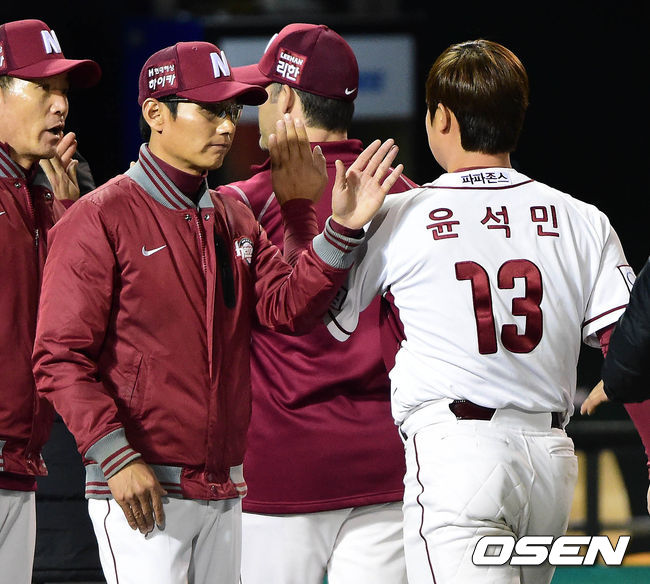 3일 오후 서울 목동구장에서 열린 '2014 한국야쿠르트 세븐 프로야구' 넥센 히어로즈와 두산 베어스의 경기 종료 후 염경엽 감독과 윤석민이 하이파이브를 하고 있다.