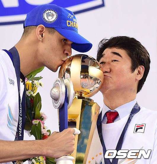 경기를 마치고 삼성화재 레오와 신치용 감독이 우승트로피에 입맞춤을 하고 있다./ rumi@osen.co.kr