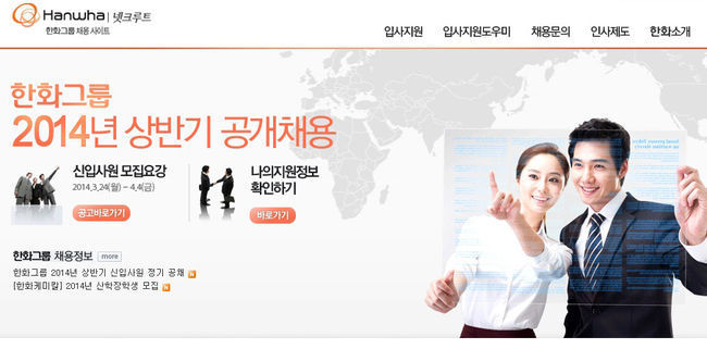 한화그룹은 올 상반기 ㈜한화·한화케미칼·한화건설·한화 S&C 등 11개 회사에서 근무할 550명의 신입사원을 선발한다. 지원 자격은 4년제 대학 학위 이상 소지자나 2014년 8월 졸업예정자다. 남자의 경우 군필자나 면제자라야 한다.