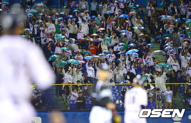 2회말 야쿠르트 공격 때 야쿠르트 홈 팬들이 우산을 들고 응원을 펼치고 있다.