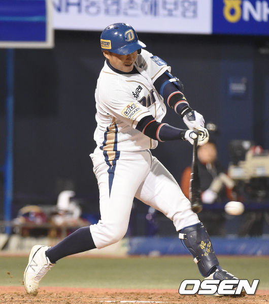 4일 오후 창원시 마산구장에서 열린 '2014 한국야쿠르트 세븐 프로야구' NC 다이노스와 넥센 히어로즈 경기, 2회말 2사 1,3루 김태군 1타점 적시타를 날리고 있다.