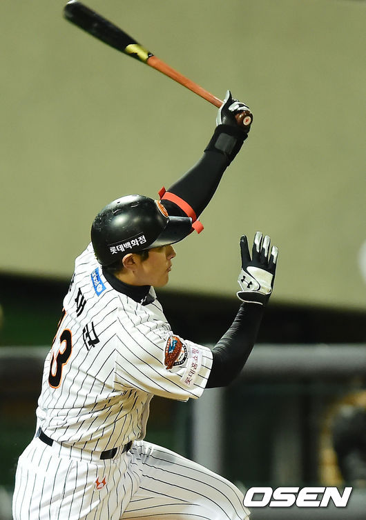 4일 오후 울산 문수야구장에서 열린 '2014 한국야쿠르트 세븐 프로야구' 롯데 자이언츠와 삼성 라이온즈의 경기, 2회말 2사 주자 2루 롯데 황재균이 좌익수 왼쪽 선취 1타점 적시타를 날리고 있다.