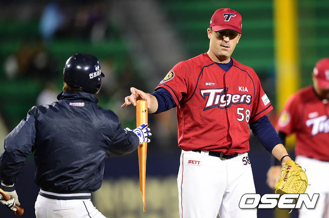 3회말 1사에서 KIA 홀튼이 두산 오재원의 부러진 배트를 주워 배트보이에게 건네고 있다.
