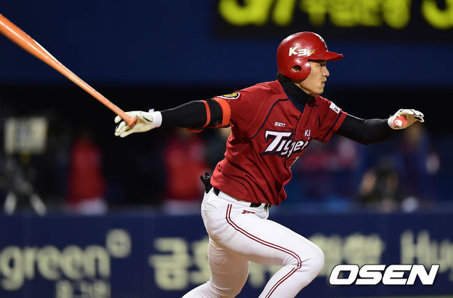 5회초 무사 1,3루에서 KIA 신종길이 우전 적시타를 치고 있다.