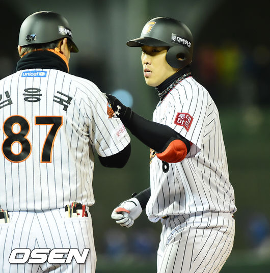 4일 오후 울산 문수야구장에서 열린 '2014 한국야쿠르트 세븐 프로야구' 롯데 자이언츠와 삼성 라이온즈의 경기, 롯데 7회말 2사 주자 없는 상황에서 대타로 나온 롯데 전준우가 좌익수 앞 안타를 날린 후 1루에서 김응국 코치와 하이파이브를 하고 있다.