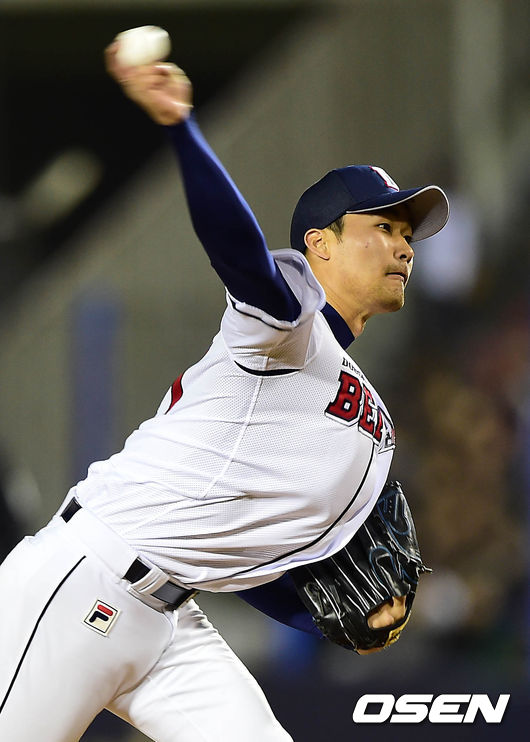 7회초 무사에서 두산 홍상삼이 힘차게 공을 던지고 있다.