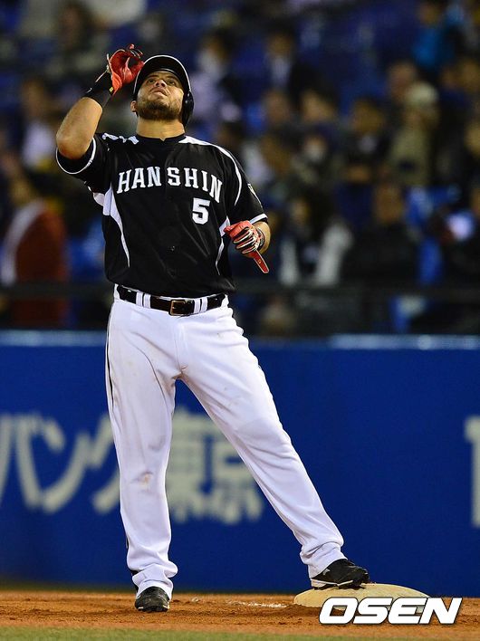 8회초 한신 공격 1사 1, 3루 상황 마우로 고메즈가 추격의 1타점 적시 우전안타를 날리고 1루에 안착해 기뻐하고 있다.