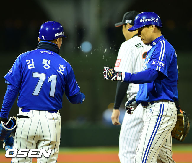 4일 오후 울산 문수야구장에서 열린 '2014 한국야쿠르트 세븐 프로야구' 롯데 자이언츠와 삼성 라이온즈의 경기, 9회초 2사 주자 1루 삼성 이승엽이 중견수 앞 안타를 날린 후 1루에서 김평호 코치와 하이파이브를 하고 있다.