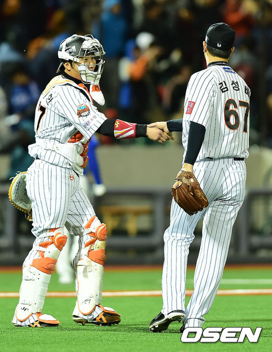 경기를 마치고 롯데 용덕한과 김성배가 악수를 나누고 있다./ rumi@osen.co.kr