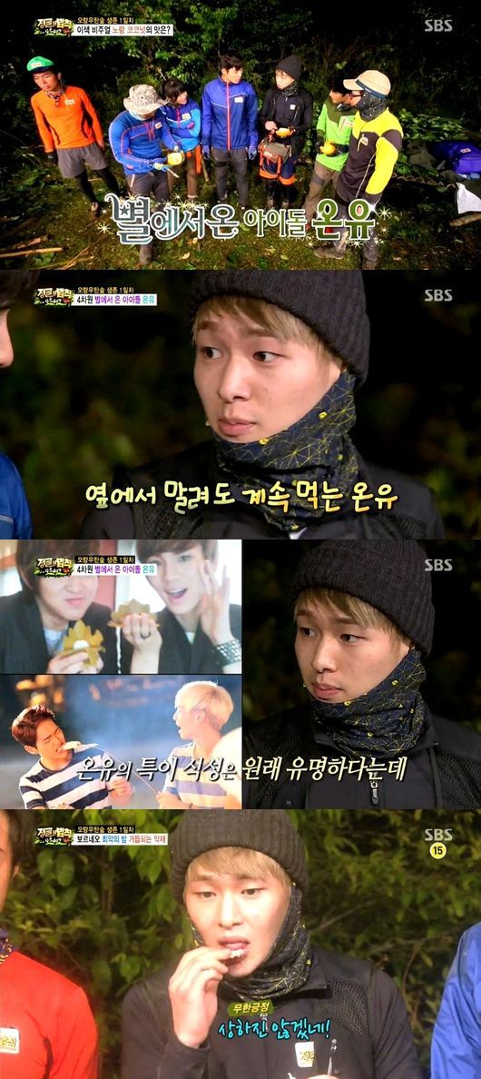 이후 멤버들은 김병만이 미리 준비해둔 쥐치포를 구워 먹었다. 하지만 이 역시 맛은 실패였다. 지나치게 짰던 것. 온유는 “정말 짜다”고 동의하면서도 “뼈도 먹을 만 하다”며 끊임 없이 쥐치포를 입에 넣었다. 멤버들은 온유의 특이 식성을 인정할 수 밖에 없었다.
