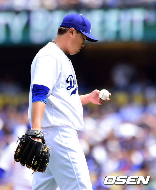1회초 최악의 피칭으로 6실점 한 류현진이 아쉬워 하고 있다./ jpnews@osen.co.kr