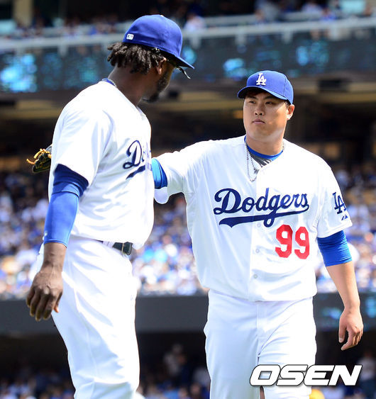 2회초 수비서 실책으로 2실점의 빌미를 제공한 라미레스를 류현진이 위로하고 있다./ jpnews@osen.co.kr
