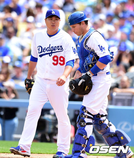 1회초 샌프란시스코 포지에게 2루타를 맞은 류현진이 A.J 앨리스 포수와 이야기를 나누고 있다./ jpnews@osen.co.kr