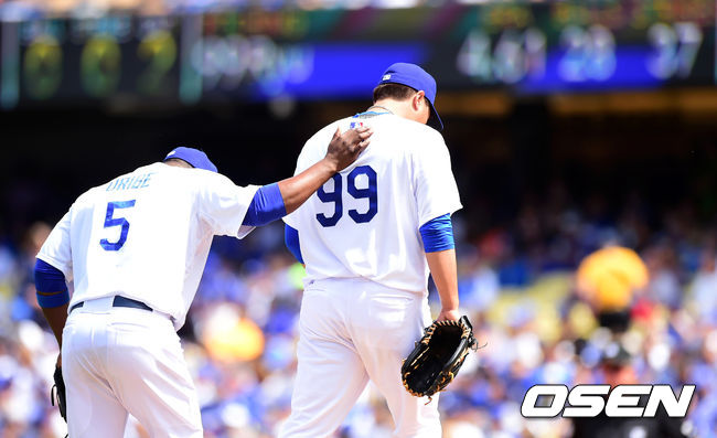 2회초 실책에 이은 안타로 추가 2실점 한 류현진을 유리베가 위로하고 있다./ jpnews@osen.co.kr