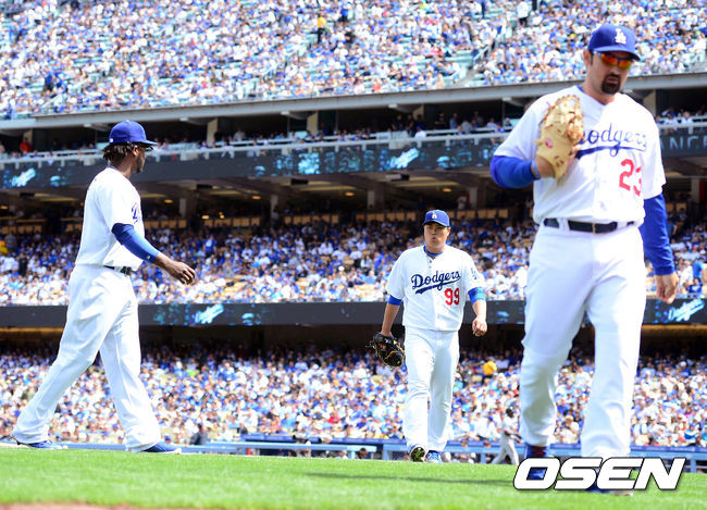1,2회 실책을 범해 류현진을 힘들게 한 라미레스와 곤살레스가 더그아웃으로 이동하고 있다./ jpnews@osen.co.kr