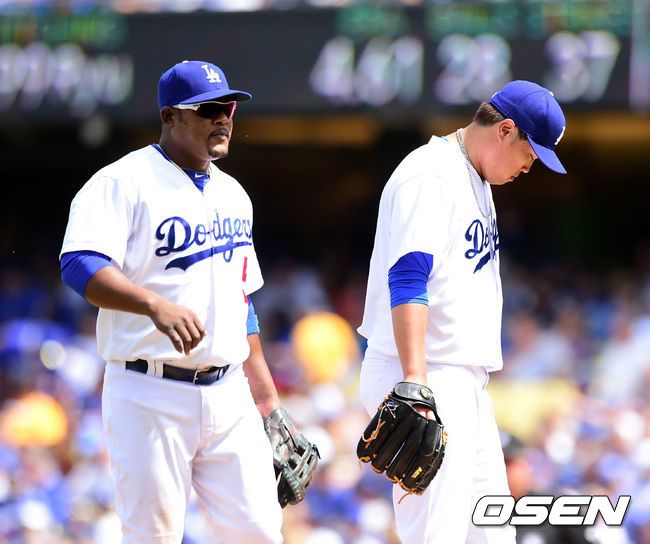 말없이 류현진을 바라보는 유리베,'내가 더 가슴 아프네'